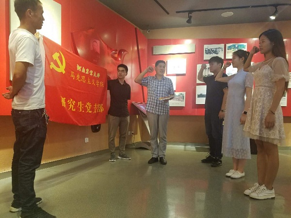本网讯(通讯员 贾书浩)为了深入学习领会习近平新时代中国特色社会主义思想和党的十九大精神,6月20日下午,永利娱乐 组织研究生党员和入党积极分子赴郑州二七纪念堂开展“不忘初心,牢记使命”主题教育活动暨2019年新党员宣誓仪式。