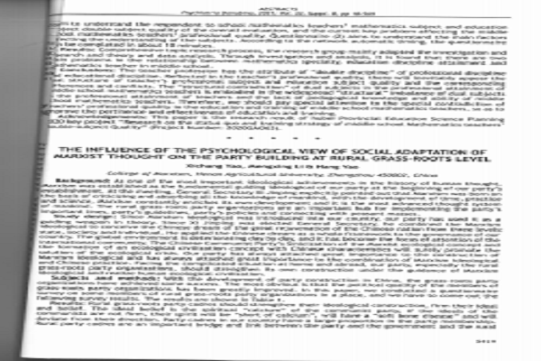 由 Offical Journal Of The Danubina Psychiatria Association主办出版的SSCI期刊Psychiatria Danubina 2021年12月suppl.8发表了我中心姚锡长教授领衔撰写的论文《THE INFLUENCEOF THE PSYCHOLOGICAL VIEW OF SOCIAL ADAPTATION OF MARXIST THOUGHT ON THE PARTY BUILDING AT RURAL GRASS-ROOTS LEVEL》,论主研究了马克思主义社会适应心理观对农村基层党建的影响。