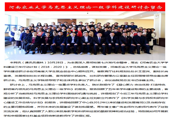 2018年10月28日,为全面深入贯彻校第七次党代会精神,落实《河南农业大学学科建设三年行动计划(2018-2020)》,总结成绩,谋划发展,河南农业大学马克思主义理论一级学科建设研讨会在河南省大学生就业创业中心顺利召开。省教育厅社科规划处处长王亚洲、副校长尚富德、发展规划处处长程功鹏、宣传部部长郭战伟、社科研究管理办公室副主任田琨等领导应邀出席研讨会。